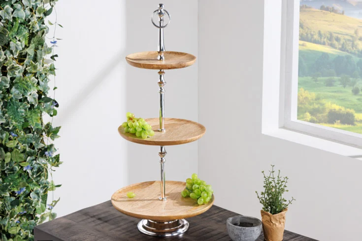 Stojan na dort, koláče, ovoce a vše co vás jen napadne. Etažér ze série MANGO PURE. Krásný vysoký etažér lze úžasně integrovat do vaší dekorace stolu a individuálně jej vybavit. Tři různé velké police/talíře z kvalitního mangovníkového dřeva nabízejí místo na pochoutky. Stojan na dort se ale skvěle hodí také jako miska na ovoce nebo na odkládání drobností. V kombinaci se zakřiveným rámem a kulatým podstavcem ve stříbrné barvě se stojan na dort stává elegantním dekorativním doplňkem, který si najde své místo v každém interiéru. Zkombinujte jej s jinými kusy nábytku ze dřeva nebo stříbra a vytvořte ucelený koncept bydlení.
