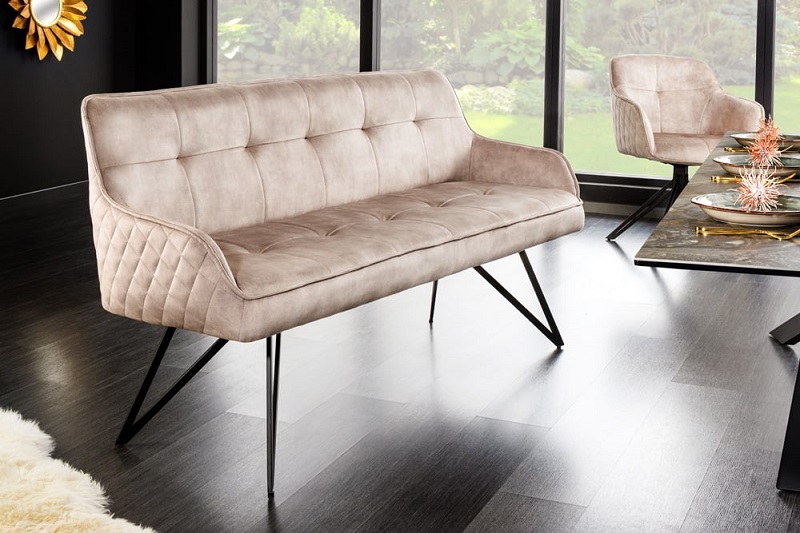 Čalouněná lavice ze série Eritrea. Stylová lavice obohatí váš domov díky svému elegantnímu a naprosto nadčasovému designu. Elegantní široké sedátko poskytuje obzvlášť příjemný zážitek z posezení, hrubé polstrování na sedáku a opěradle zaujme trendovým designem. Lavice má potah ze sametu v champagne barvě. Černé kovové nohy tvoří skvělý kontrast k elegantnímu sametovému potahu sedačky a zajišťují bezpečnou oporu na jakémkoli povrchu. Čalouněná lavice s vysokým opěradlem a širokými opěrkami vás pohodlně usadí i na delší dobu. Pohodlná sedací část je potažena a prošita sametem. Materiál se snadno čistí a udržuje. Konstrukce je vyrobena z kovu v černé barvě. Nosnost lavice je Max. 375kg. Krásná lavice je kombinovatelná s širokou škálou jídelních stolů. Stylová čalouněná lavice vynikne v každém moderním interiéru.