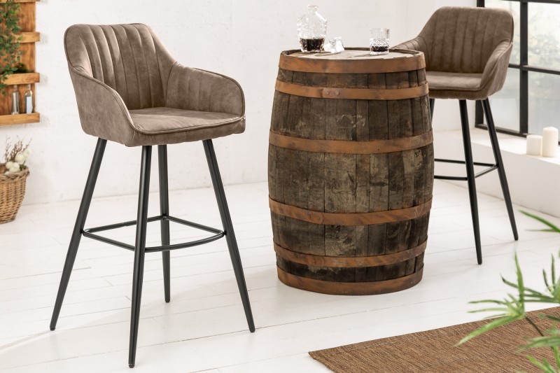 Designová barová židle ze série Turino. Barová židle je zajímavá svým provedením a tvarem. Tvarovaný sedák s područkami vás pohodlně usadí. Jemná linie opěradla přechází do boků, přičemž zajišťuje příjemně komfortní sezení. Dekorativní prošívání na opěradle a opěrkách. Provedení v mikrovláknu v barvě taupe, které je příjemné na dotek. Konstrukce je z kovu a proto je pevná. Nohy barové židle jsou z kovu v černém provedení. Krásná barová židle do vaší kuchyně nebo jídelny, vynikne při jakémkoliv barovém pultu.