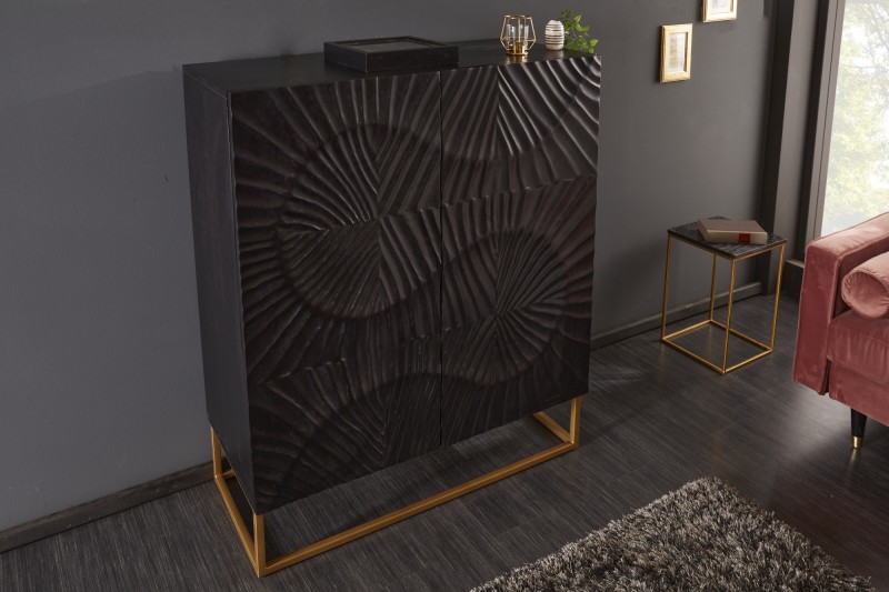 Skříňka v 3D designu ze série Scorpion. Skříňka je zajímavá svým provedením. Jedinečné spojení masivního dřeva a lesklého kovu v originálním tvaru. Skříňka je vyrobena z mangového dřeva v černém provedení. Přední část skříňky je výjimečně tvarovaná jakoby 3D vlnami. Hrboly a barevné odchylky jsou součástí designu. Skříňka je postavena na rámu z kovu ve zlaté barvě. Vysoká skříňka poskytuje dostatečný úložný prostor formou dvou skříněk se 6 policemi. Na dvířkách je Soft Close zavírací mechanismus. Zkombinujte si skříňku s moderním nábytkem nebo nechte vyniknout samostatně v obývacím pokoji, ložnici či jiné místnosti.