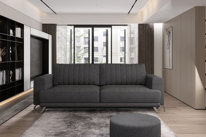 Krásná moderní sedačka ze série Elise. Velká rozkládací sedačka do moderního obývacího pokoje. Sedačka poskytuje jedinečný vzhled, jedinečný styl a mimořádné pohodlí. Jedinečný kus nábytku, který zapadne do každého interiéru díky jemným konturám, stylovým detailům a povrchové úpravě a klasickému tvaru. Moderní rafinovaný tvar zvýrazňují dva velké polštáře na opěradle a masivní opěrky, které jsou dekorativně prošívané elegantním svislým vzorem. Sedačka má potah ze strukturované látky v antracitové barvě. Potah je velmi měkký a příjemný na dotek a jeho špičková kvalita zajišťuje vysokou odolnost proti opotřebení a zabarvení. Rozkládací sedačka je moderní a pohodlná k sezení, tak k relaxaci či regeneraci během noci. Díky spolehlivému, automatickému systému DL můžete tuto stylovou sedačku přeměnit na jedinečnou postel s spací plochou o rozměrech 215x145cm. Funkční sedačka poskytuje dostatek pohodlí, neboť výplň sedáku a opěradla tvoří HR pěna, jakož i T25, které jsou odolné vůči všem druhům nevzhledných prohlubní a jamek. Sedačka obsahuje také prostor pro uložení ložního prádla. Zkombinujte si ji s moderním nábytkem ve vašem obývacím pokoji.