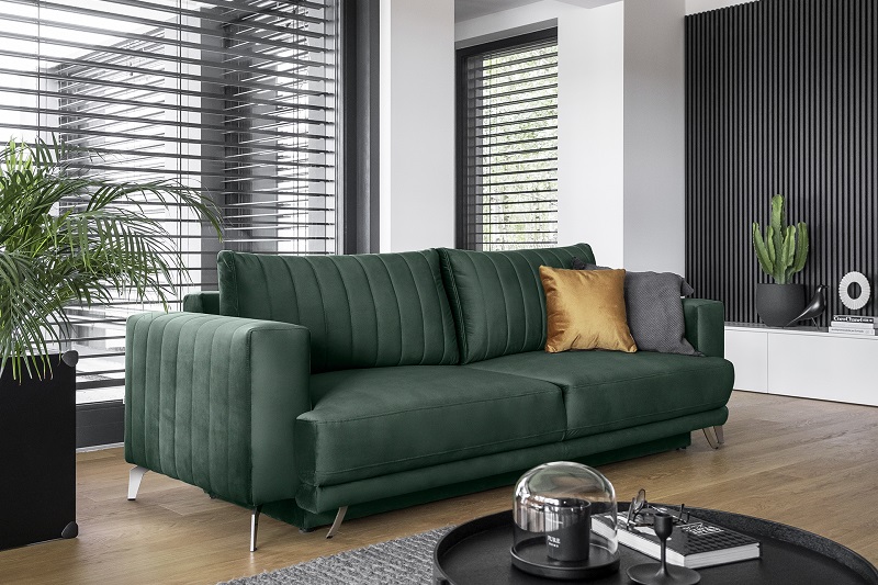 Krásná moderní sedačka ze série Elise. Velká rozkládací sedačka do moderního obývacího pokoje. Sedačka poskytuje jedinečný vzhled, jedinečný styl a mimořádné pohodlí. Jedinečný kus nábytku, který zapadne do každého interiéru díky jemným konturám, stylovým detailům a povrchové úpravě a klasickému tvaru. Moderní rafinovaný tvar zvýrazňují dva velké polštáře na opěradle a masivní opěrky, které jsou dekorativně prošívané elegantním svislým vzorem. Sedačka má potah ze sametu v tmavě zelené barvě. Potah je velmi měkký a příjemný na dotek a jeho špičková kvalita zajišťuje vysokou odolnost proti opotřebení a zabarvení. Rozkládací sedačka je moderní a pohodlná k sezení, tak k relaxaci či regeneraci během noci. Díky spolehlivému, automatickému systému DL můžete tuto stylovou sedačku přeměnit na jedinečnou postel s spací plochou o rozměrech 215x145cm. Funkční sedačka poskytuje dostatek pohodlí, neboť výplň sedáku a opěradla tvoří HR pěna, jakož i T25, které jsou odolné vůči všem druhům nevzhledných prohlubní a jamek. Sedačka obsahuje také prostor pro uložení ložního prádla. Zkombinujte si ji s moderním nábytkem ve vašem obývacím pokoji.