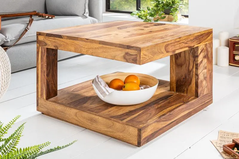 Konferenční stolek ze série Makassar. Stolek je vyroben z masivního dřeva Sheesham – odrůda indického palisandru, který se vyznačuje pěknou kresbou a strukturou dřeva, proto se používá k výrobě nábytku. Naturální provedení bez chemických barviv a laků, povrchová úprava je pouze olejováním a voskováním. Přirozenost a robustnost stolku se pojí s puristickým designem, čímž zajišťuje přirozené a jasné prostředí. Desky stolku jsou hrubé, elegantně a nenápadně spojeny v rozích, čímž vytvářejí dostatek úložného prostoru pro TV příslušenství, časopisy a pod. Tento krásný konferenční stolek je jedinečný a elegantní, díky čemuž skutečně upoutá pozornost a zapůsobí svým elegantním a jednoduchým designem. Stolek má rozměry 60x60cm a je vysoký 40 cm. Využijte jej jako příruční stolek nebo jako ideální stolek do menších prostor. Stolek je z masivního dřeva s povrchovou úpravou olejováním a voskováním. Konferenční stolek můžete kombinovat s masivním nábytkem ze série Makassar, Laose a Romeo.