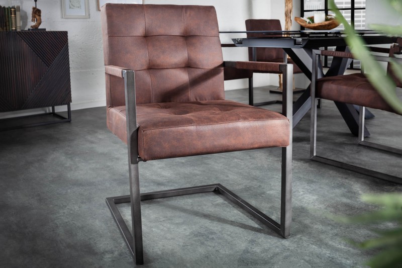 Jídelní židle ze série Robel. Židle má kovový rám, který přechází od spodní části až k opěradlu. Nohy v jedné linii přes opěrky na ruce, zpevněná v zadní části. Kovová konstrukce je v černé barvě s mikrovláknem na područkách. Sedák je čalouněný a prošívaný mikrovláknem ve vintage hnědé barvě. Pevná hrubá výplň zaručuje pohodlné sezení. Opěradlo je vysoké. Design doplňuje prošívání na sedáku i opěrce. Designová židle pro moderní jídelnu. Nosnost židle je do 120kg. Na židli se nesmí houpat, riskujete polámení konstrukce.