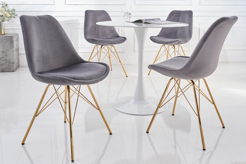 Designová židle ze série Scener Retro je skutečnou designovou klasikou mezi židlemi. Jídelní židle je zajímavá svým elegantním barevným a materiálovým provedením. Komfortní sedák se sametovým potahem v šedé barvě doplňují kovové nohy ve zlatém provedení, čímž jí dodávají zajímavý vzhled. Sedací část je pevná s vysokou opěrkou, sedák je polstrovaný, měkký. Židle vynikne v moderním prostoru. Celá konstrukce je pevná. Nosnost židle je do 110kg. Na židli se nesmí houpat, riskujete polámání nohou. Stylová židle v retro designu se přizpůsobí jakémukoli prostředí, ať už v jídelně, v restauraci nebo v konferenční místnosti. Zkombinujte si ji s moderním jídelním stolem ve vaší jídelně nebo kuchyni.