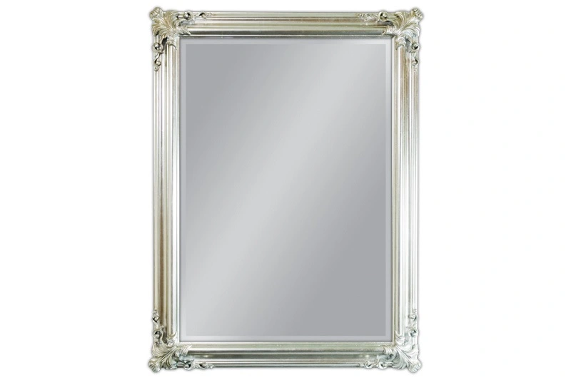 Zrcadlo na stěnu s vyřezávaným rámem ve stříbrné barvě.