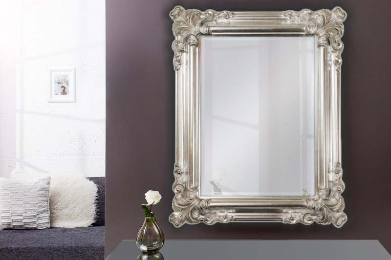 Zrcadlo na stěnu s vyřezávaným rámem ve stříbrné barvě.